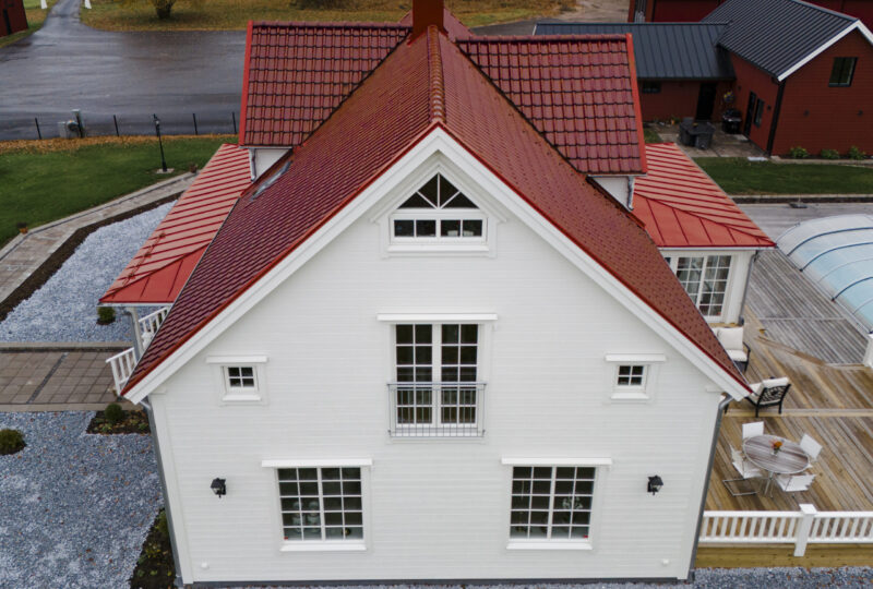 Befintlig mexitegelfasad byttes ut mot vacker tilläggisolerad träfasad med välanpassade detaljer.