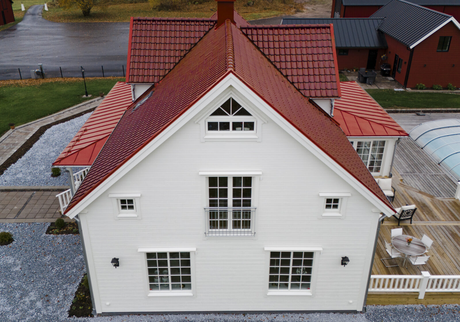 Befintlig mexitegelfasad byttes ut mot vacker tilläggisolerad träfasad med välanpassade detaljer.