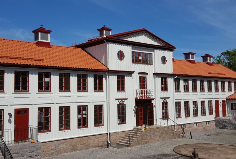 Byggteknik: Befintlig Q märkt byggnad med högt bevarandevärde som totalrenoverats, nyproduktion tvåvåningshus med trästomme.